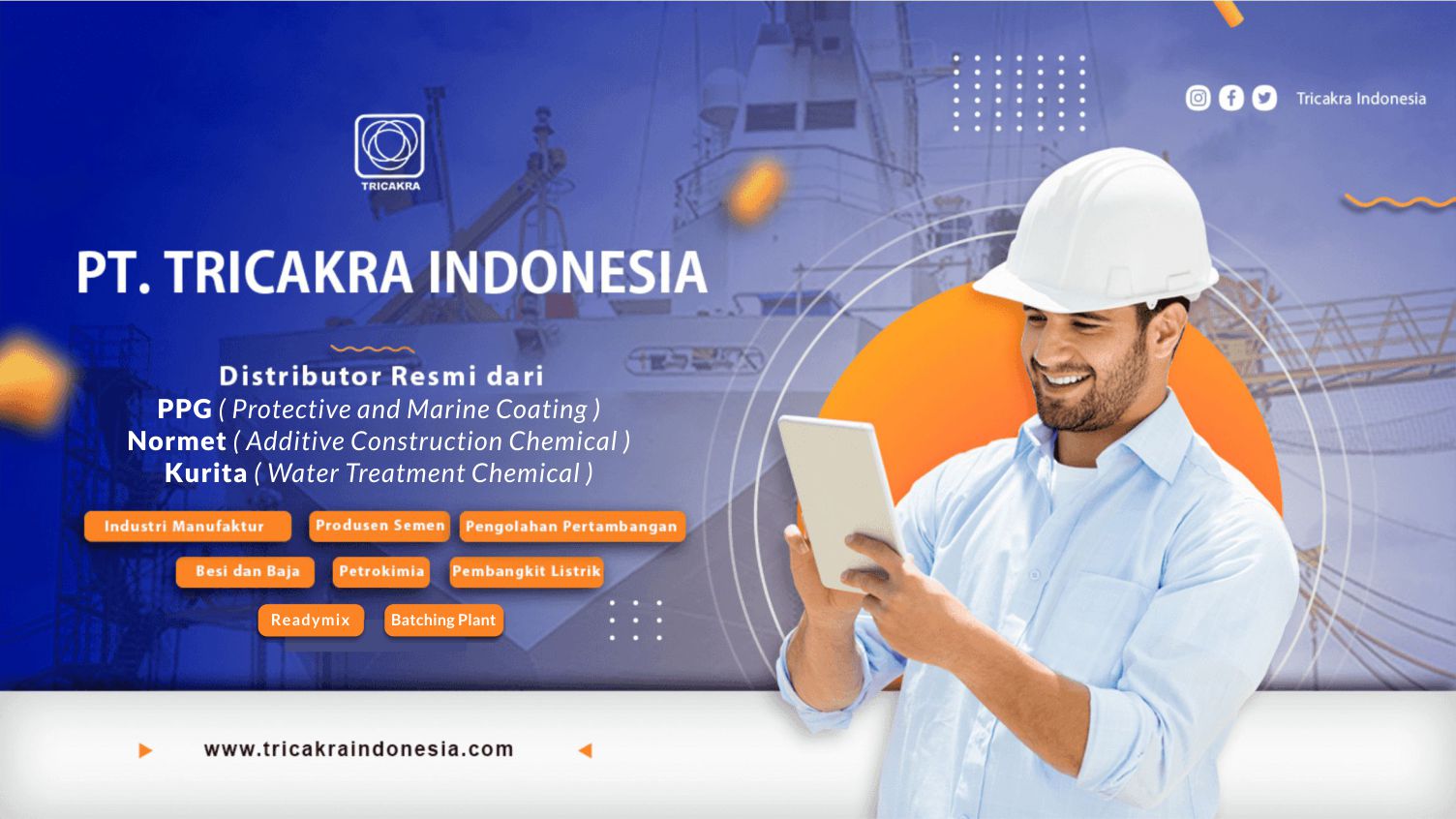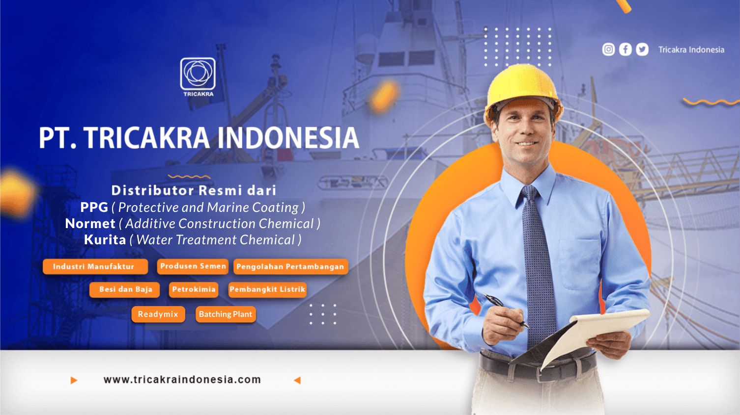 Kami merupakan distributor resmi dari 3 perusahaan besar di Indonesia yaitu PPG (Protective and Marine Coating), Normet (Additive Construction Chemical), Kurita (Water Treatment Chemical).